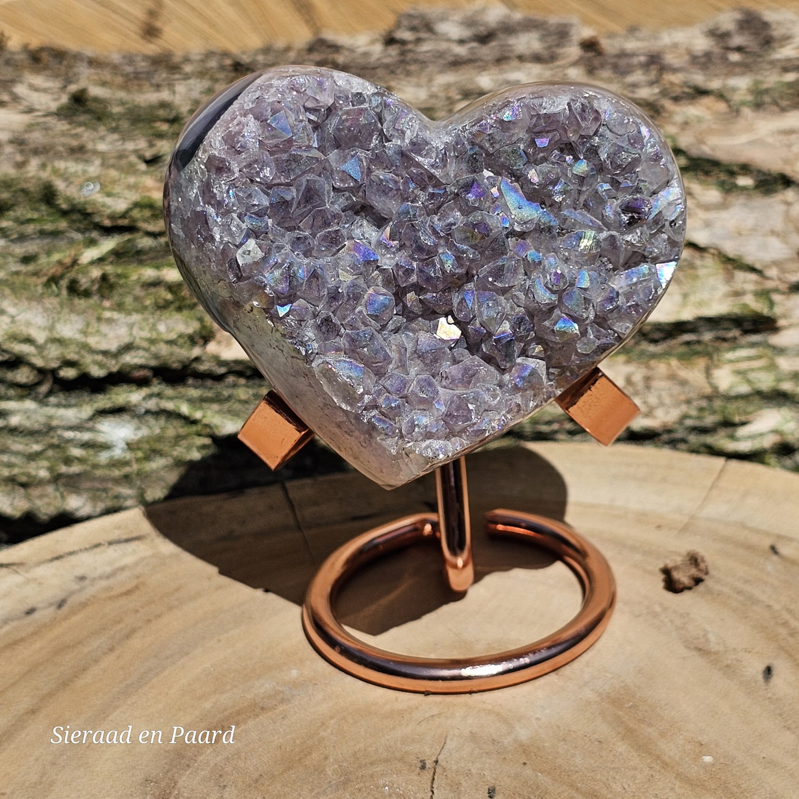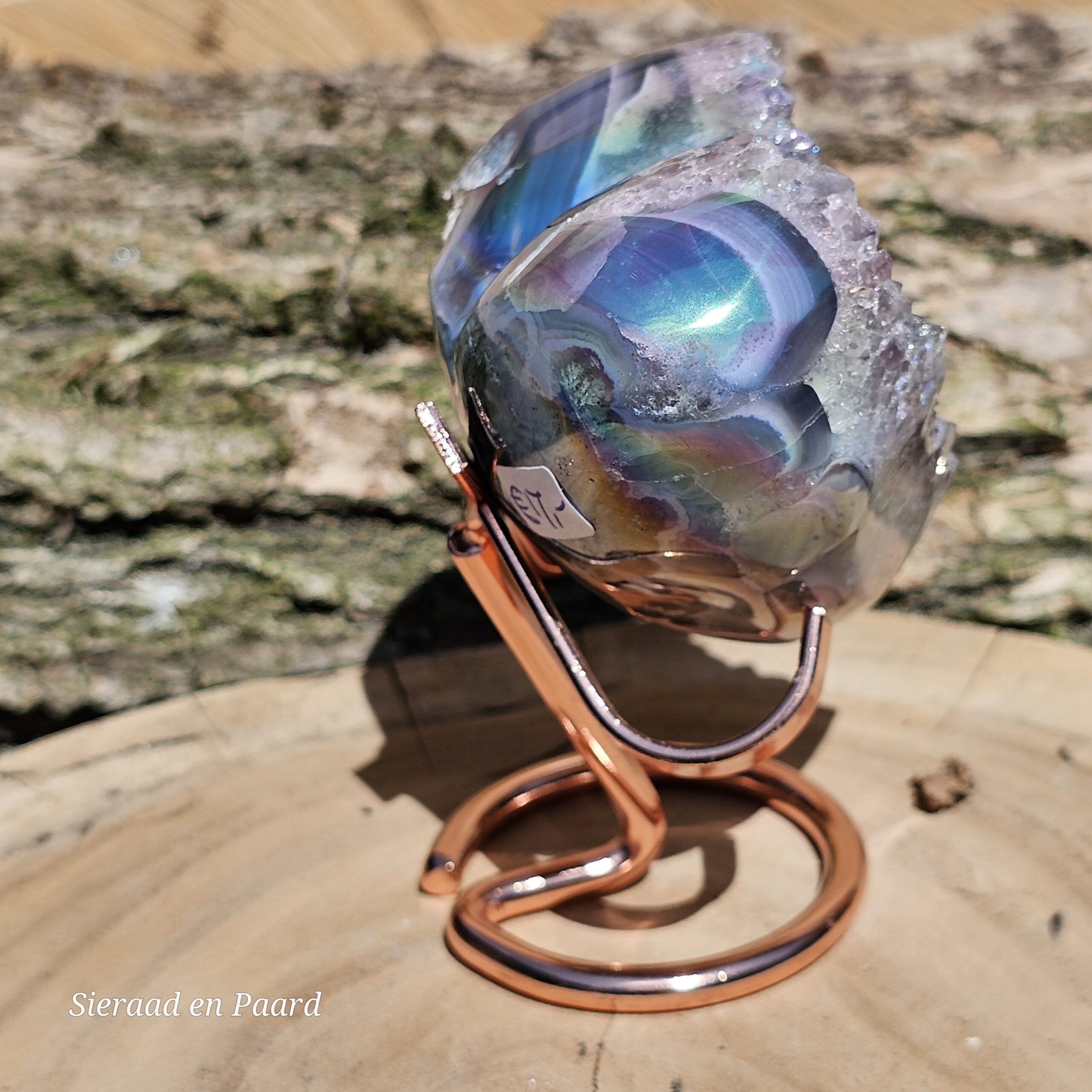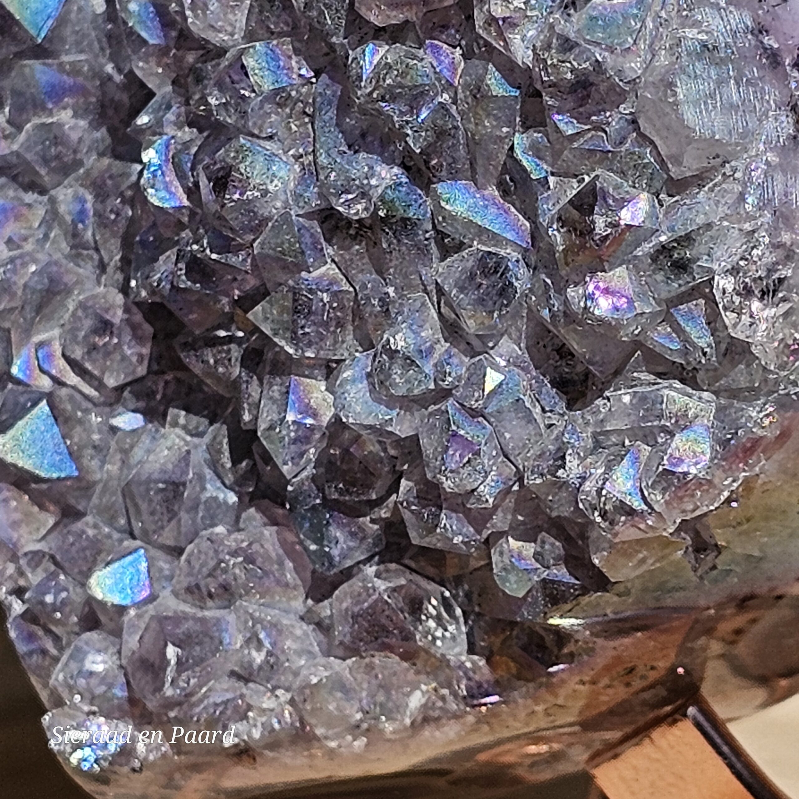 Deze Amethist heeft handmatig een Angel Aura coating gekregen. Deze coating is oa een bewerking met platinum en zilver en door verhitting krijgt de edelsteen een speciale kleur wat hem nog unieker maakt dan dat hij van nature al is. Deze laag is permanent en kan er niet afgewassen worden. Door het combineren van Amethist met Zilver en Platinum krijgt de steen ook daar zijn kwaliteiten nog extra van.
