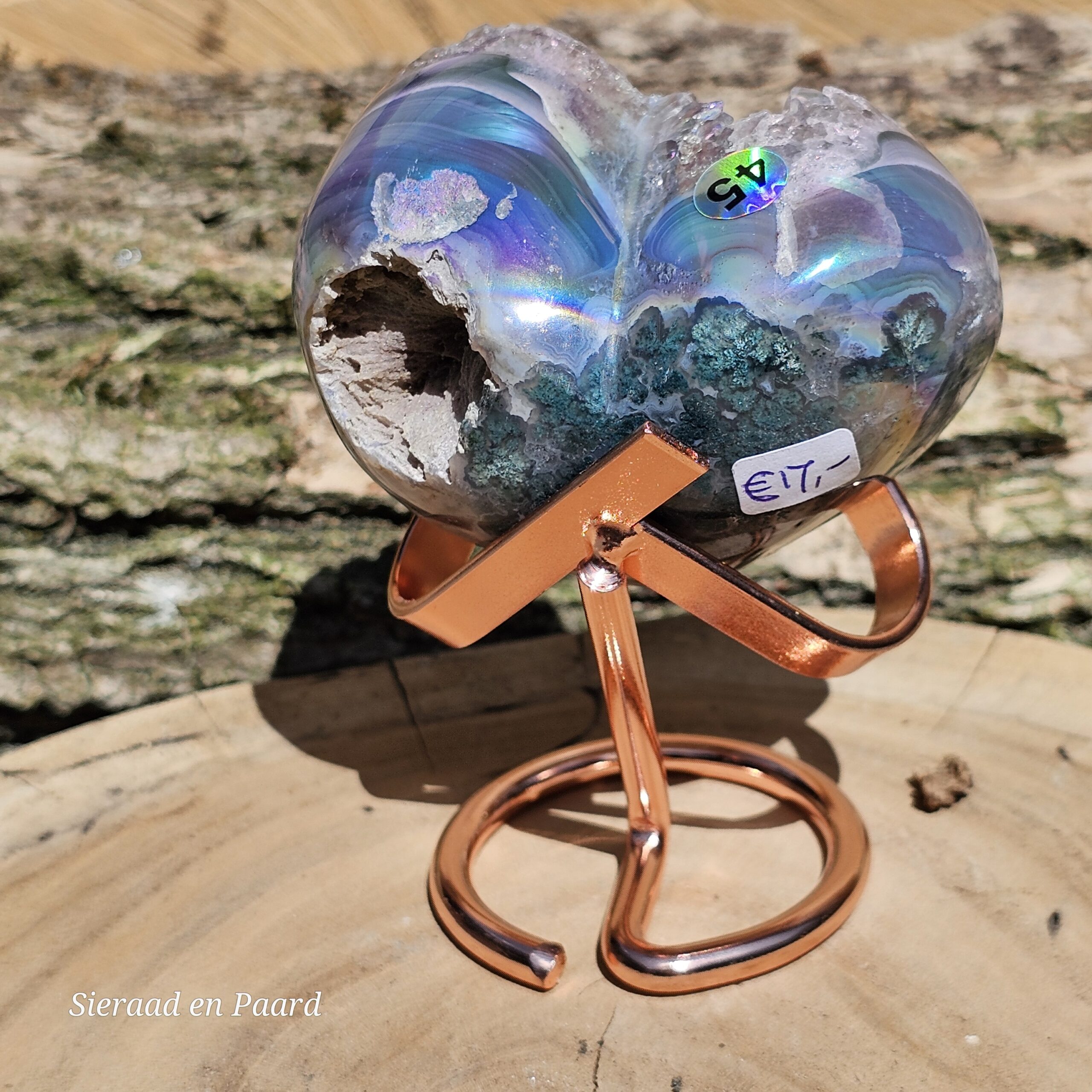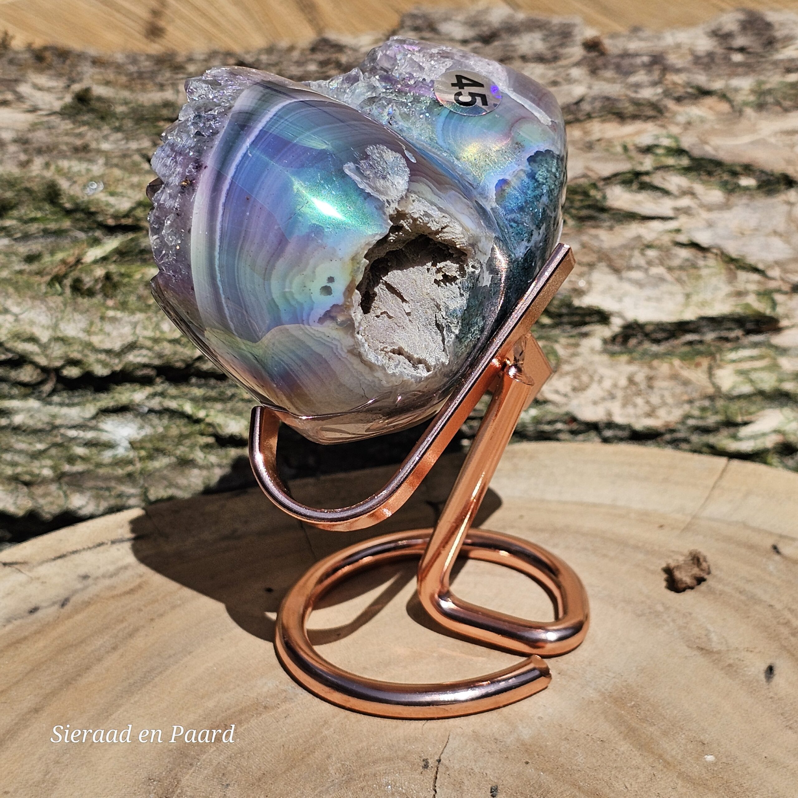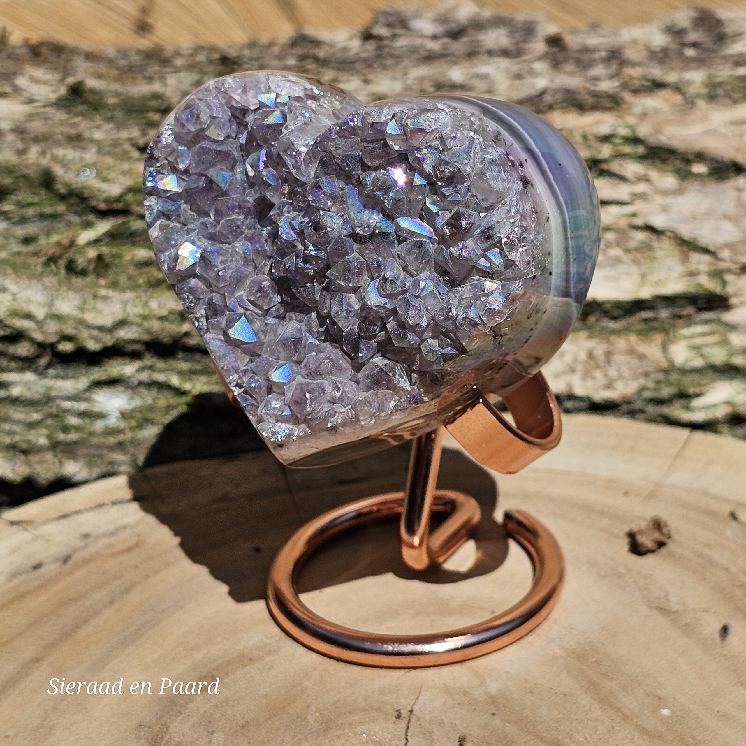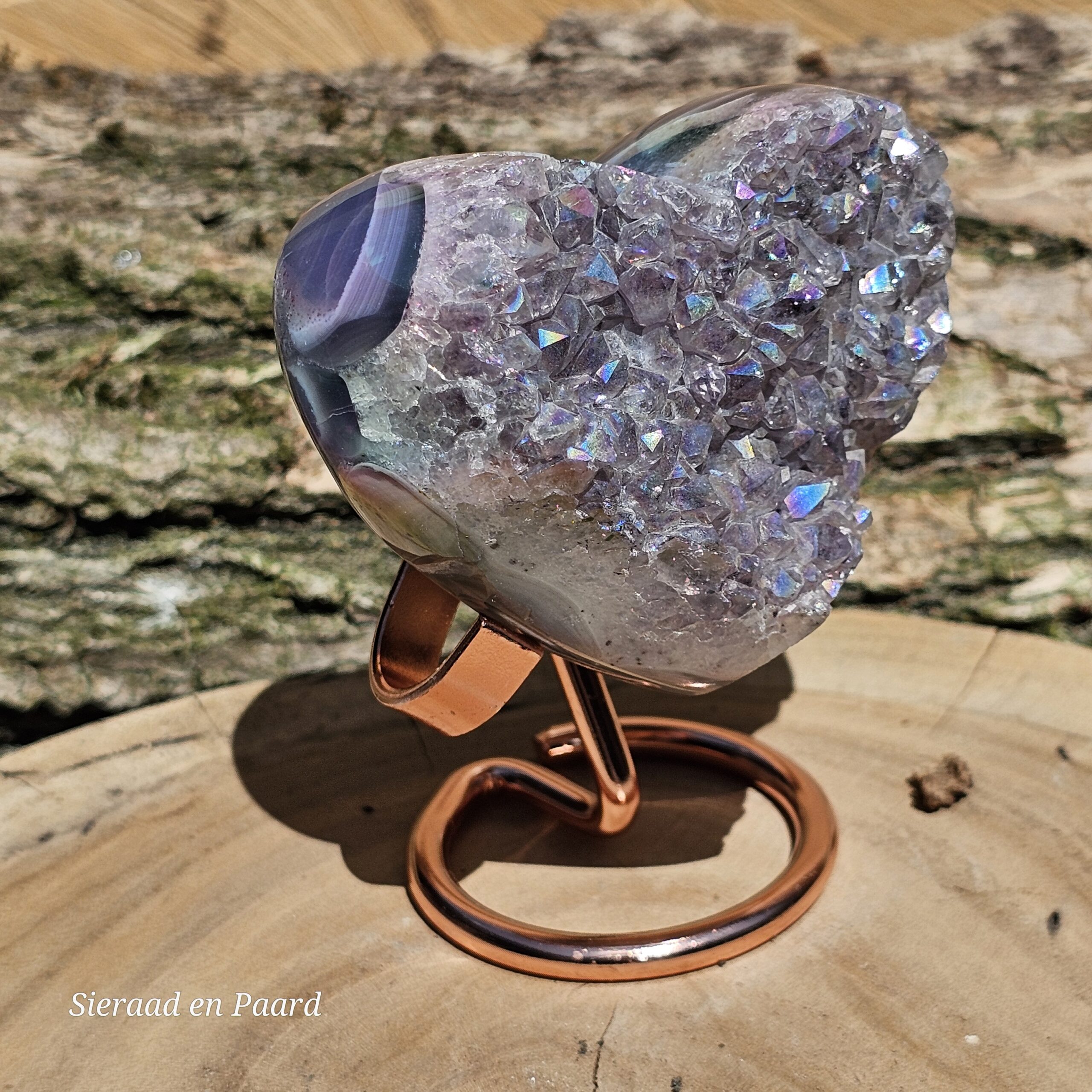 Deze Amethist heeft handmatig een Angel Aura coating gekregen. Deze coating is oa een bewerking met platinum en zilver en door verhitting krijgt de edelsteen een speciale kleur wat hem nog unieker maakt dan dat hij van nature al is. Deze laag is permanent en kan er niet afgewassen worden. Door het combineren van Amethist met Zilver en Platinum krijgt de steen ook daar zijn kwaliteiten nog extra van.