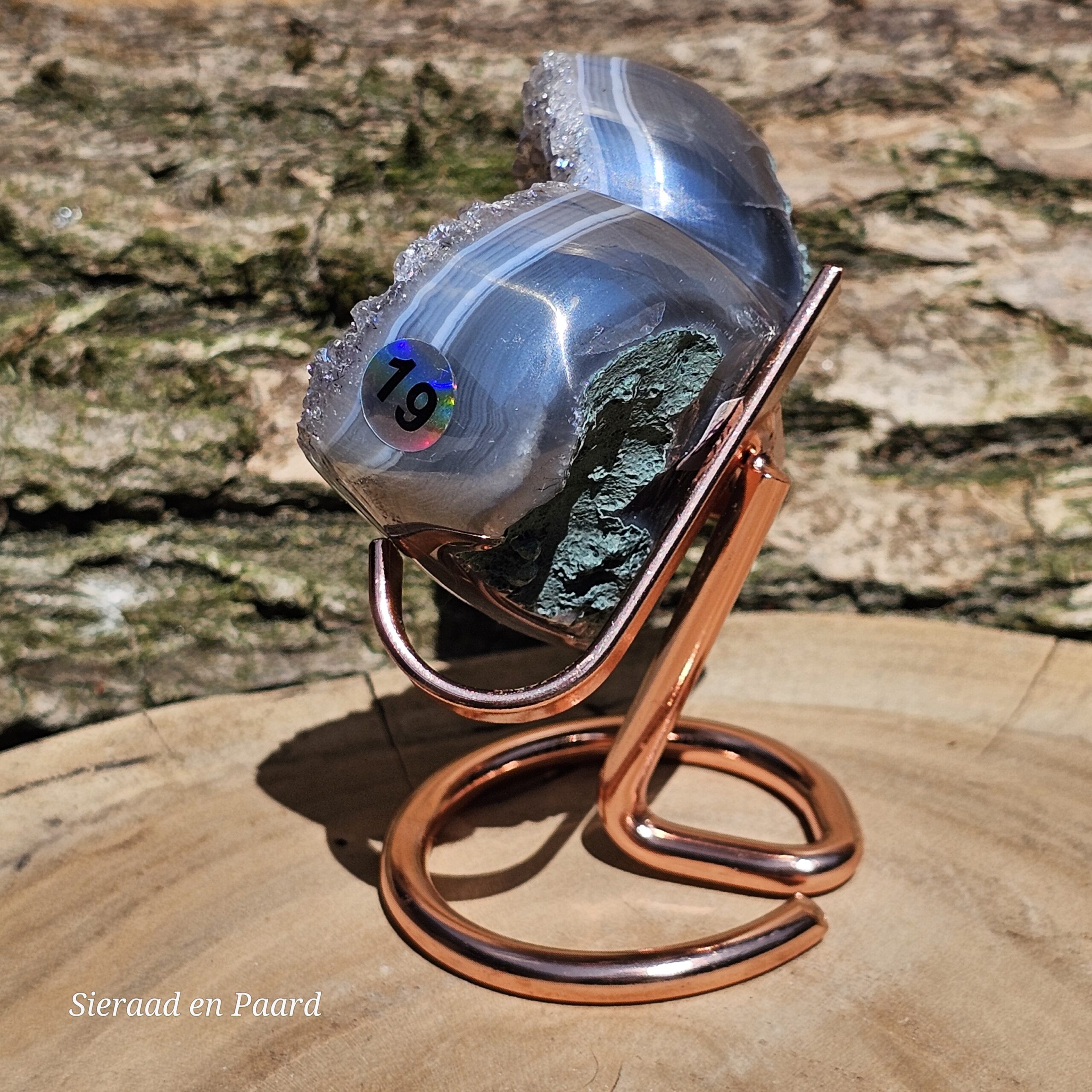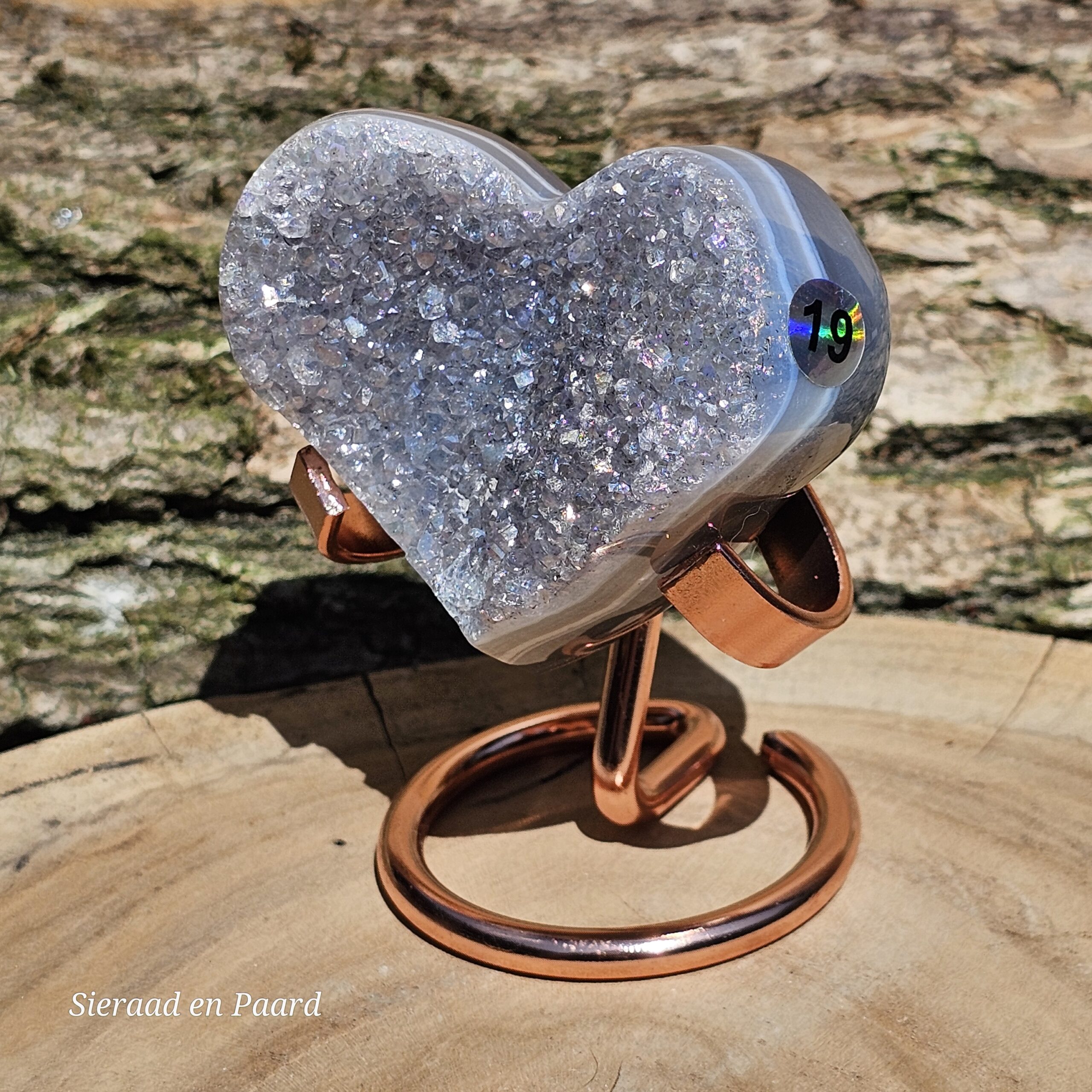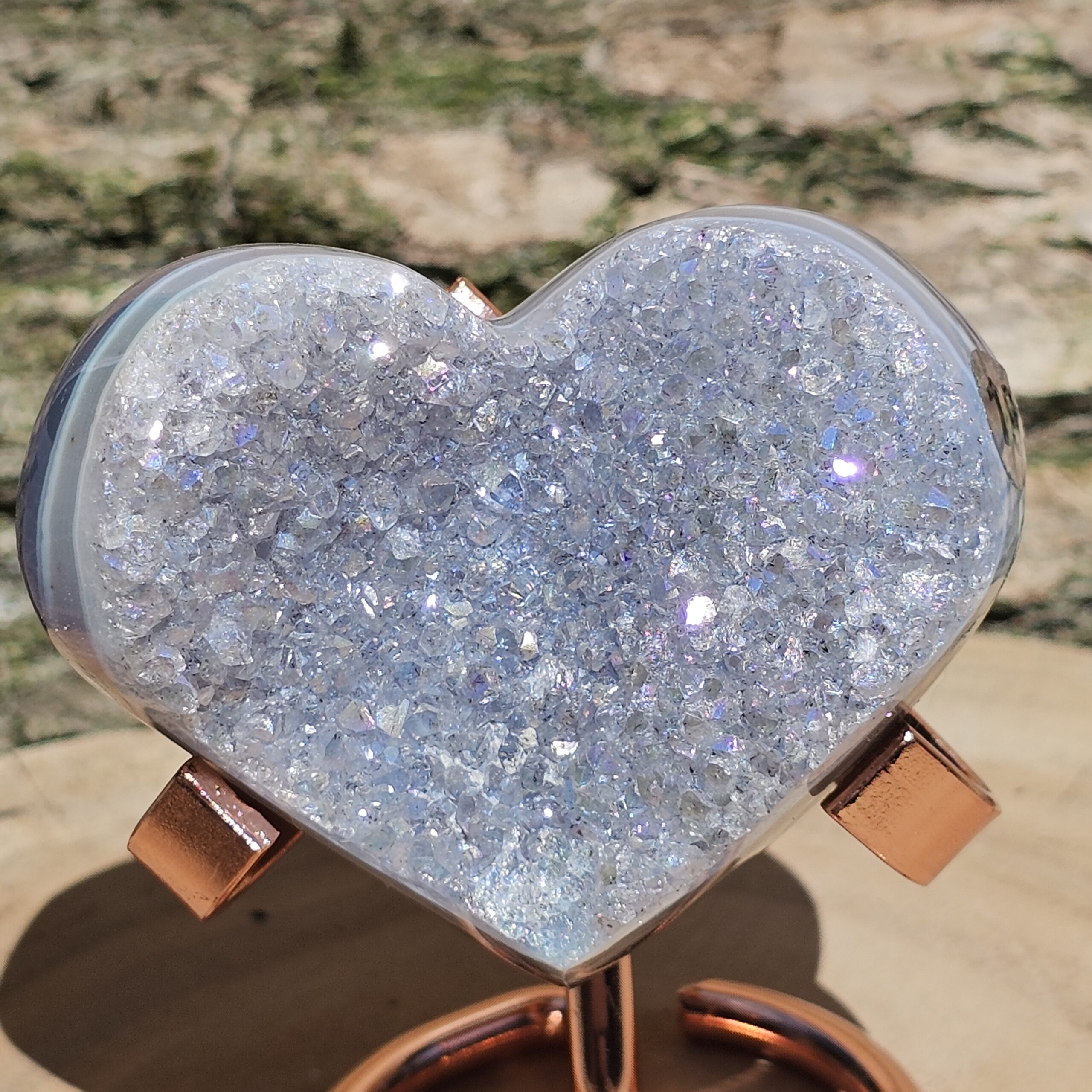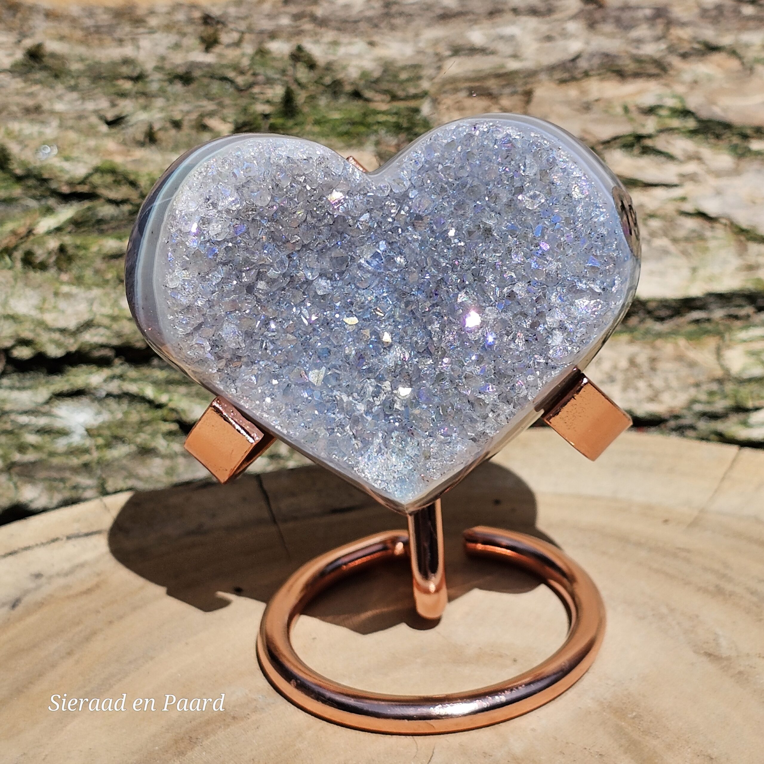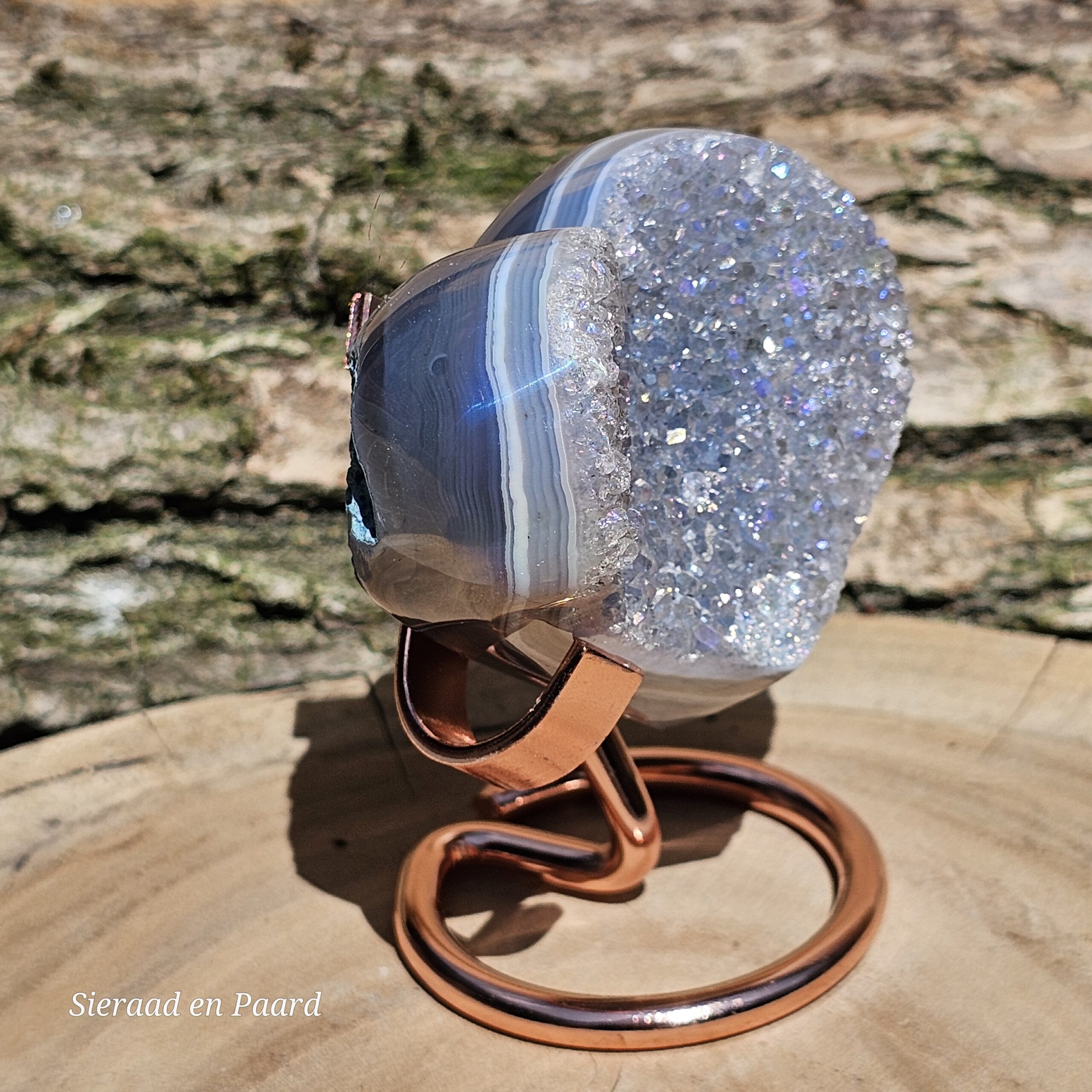 Deze Amethist heeft handmatig een Angel Aura coating gekregen. Deze coating is oa een bewerking met platinum en zilver en door verhitting krijgt de edelsteen een speciale kleur wat hem nog unieker maakt dan dat hij van nature al is. Deze laag is permanent en kan er niet afgewassen worden. Door het combineren van Amethist met Zilver en Platinum krijgt de steen ook daar zijn kwaliteiten nog extra van.