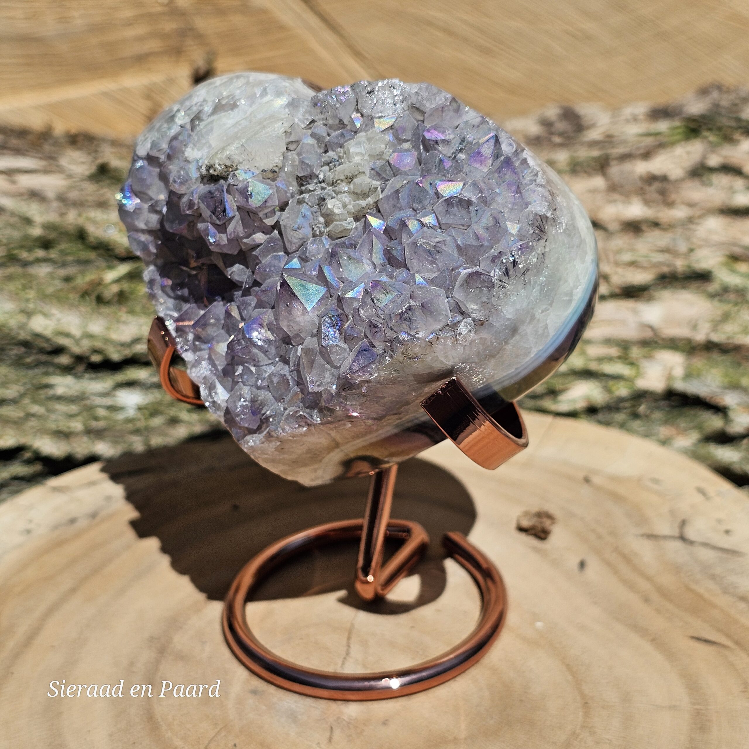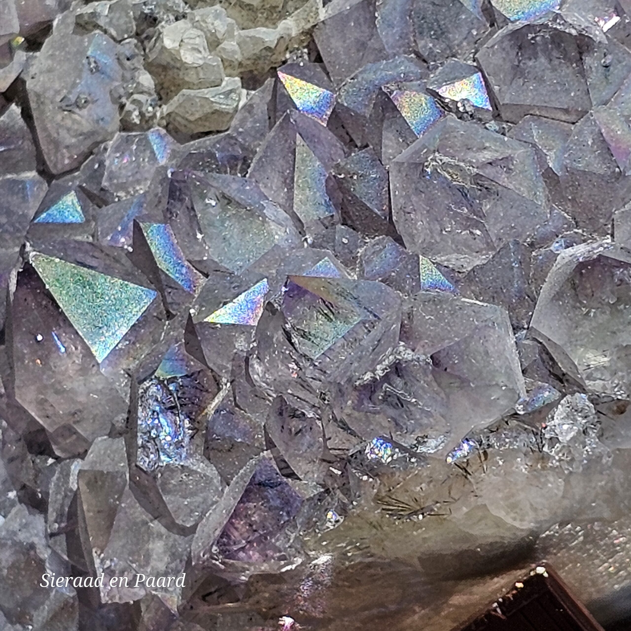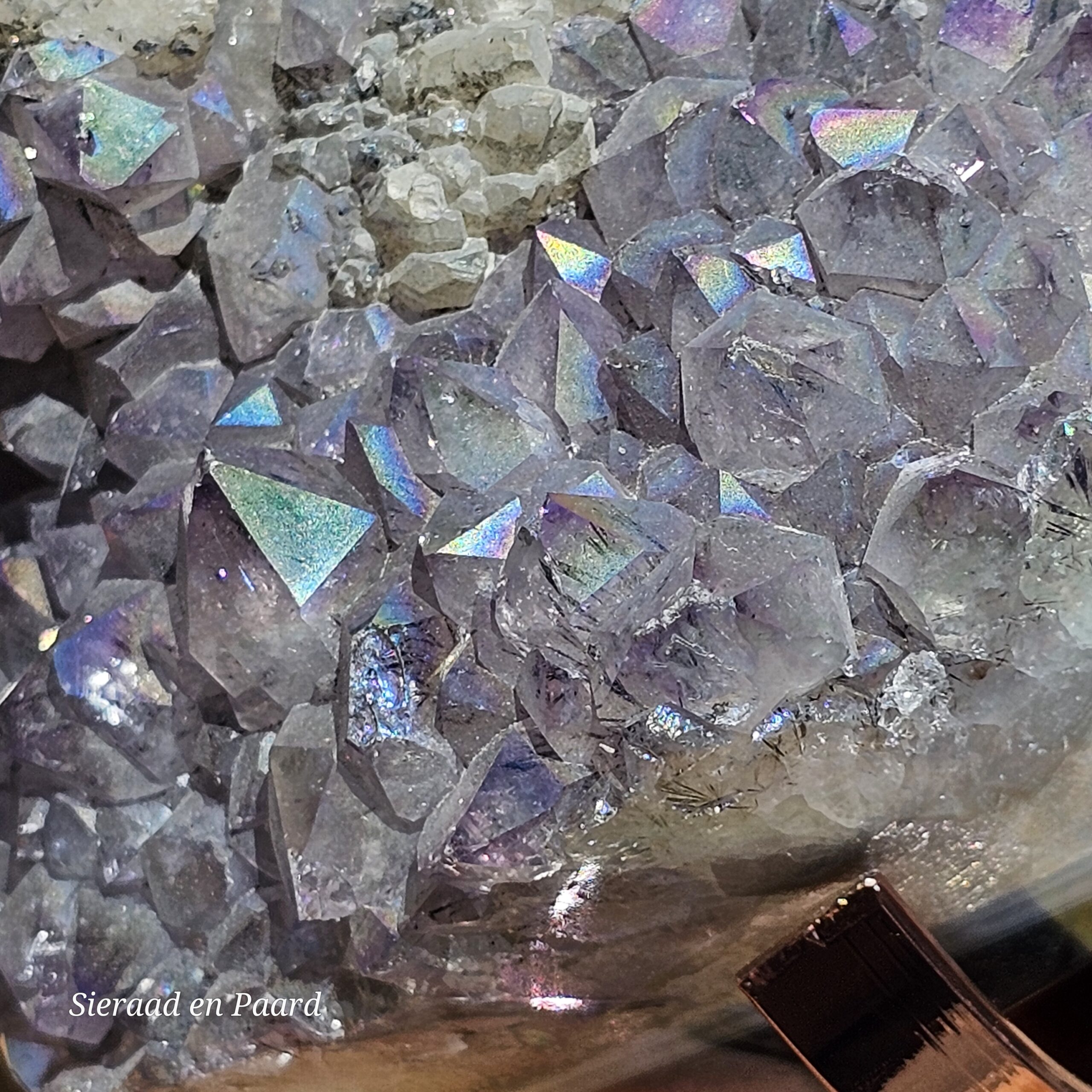 Deze Amethist heeft handmatig een Angel Aura coating gekregen. Deze coating is oa een bewerking met platinum en zilver en door verhitting krijgt de edelsteen een speciale kleur wat hem nog unieker maakt dan dat hij van nature al is. Deze laag is permanent en kan er niet afgewassen worden. Door het combineren van Amethist met Zilver en Platinum krijgt de steen ook daar zijn kwaliteiten nog extra van.