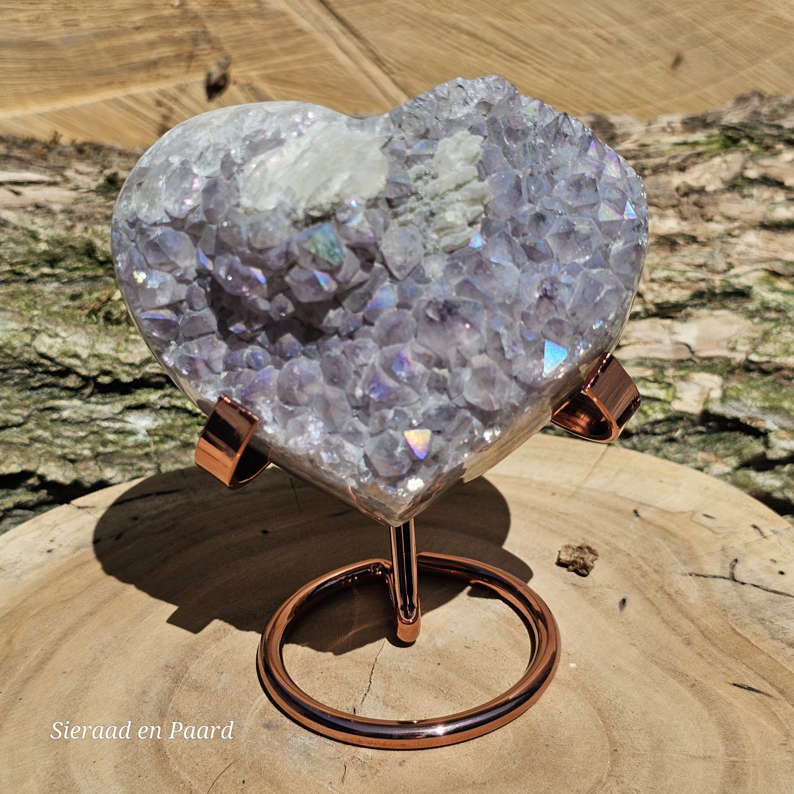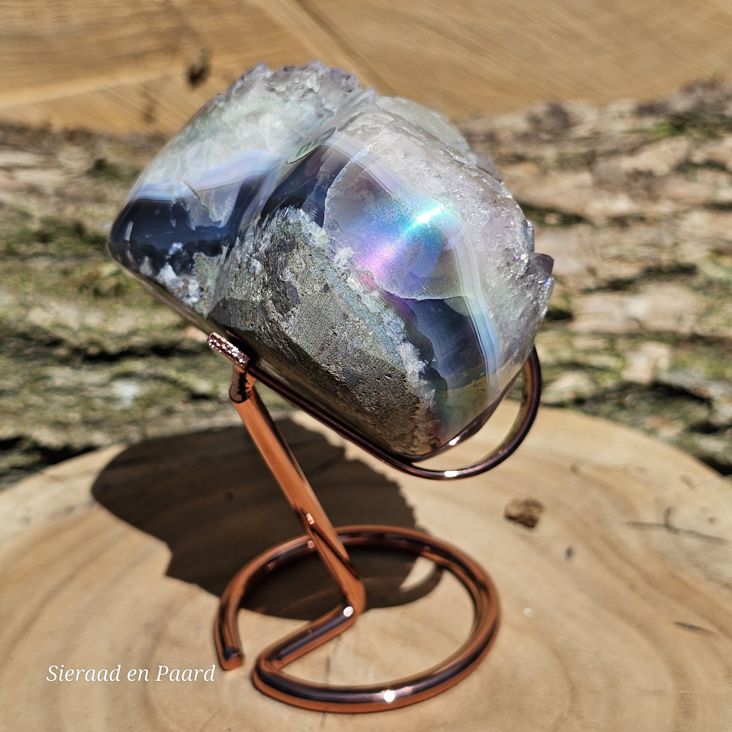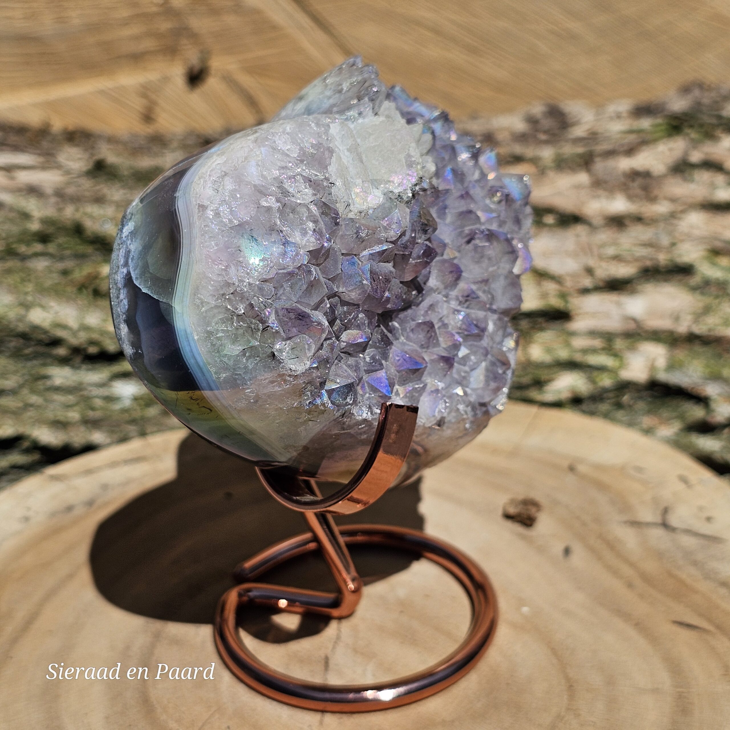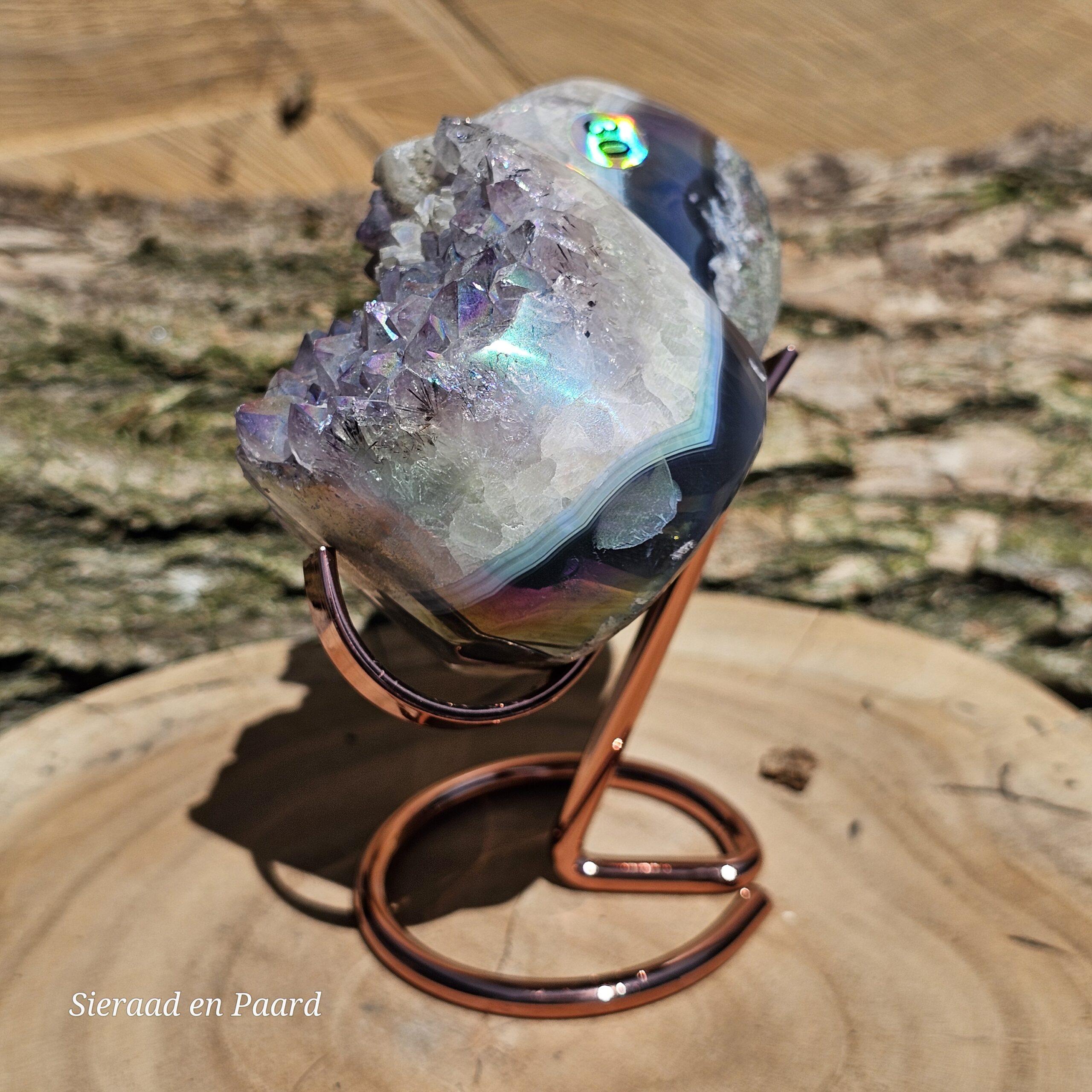 Deze Amethist heeft handmatig een Angel Aura coating gekregen. Deze coating is oa een bewerking met platinum en zilver en door verhitting krijgt de edelsteen een speciale kleur wat hem nog unieker maakt dan dat hij van nature al is. Deze laag is permanent en kan er niet afgewassen worden. Door het combineren van Amethist met Zilver en Platinum krijgt de steen ook daar zijn kwaliteiten nog extra van.