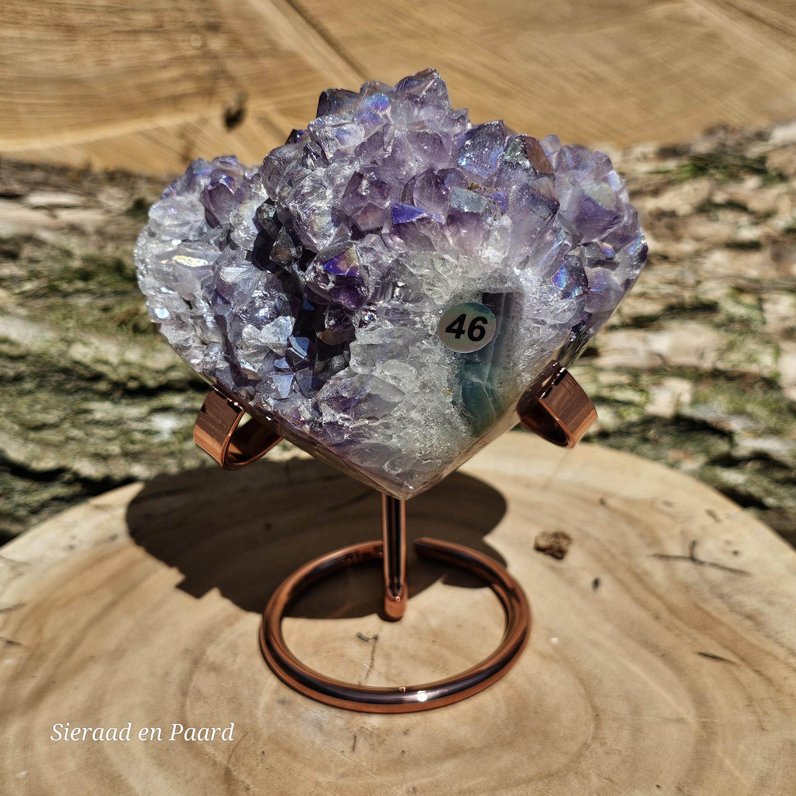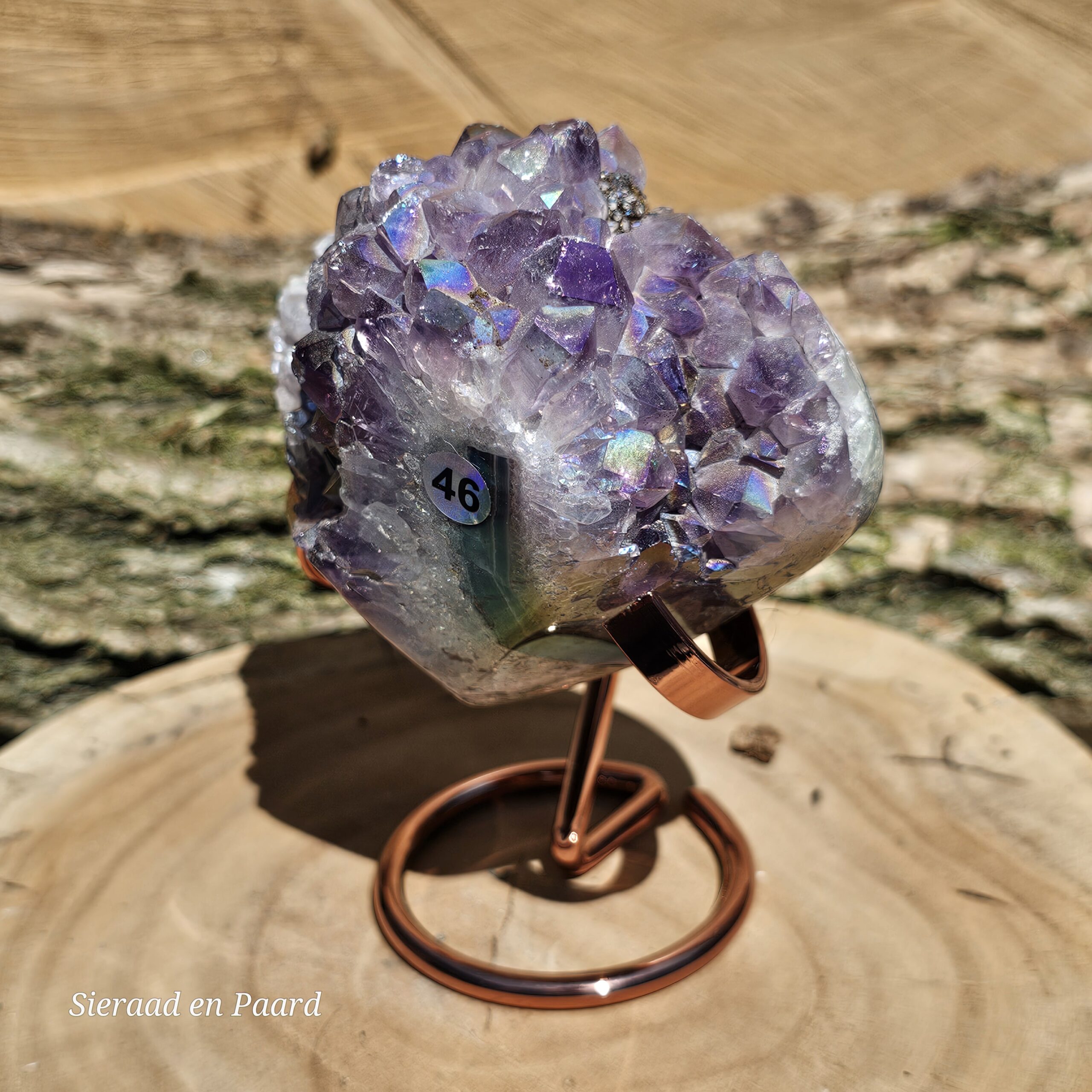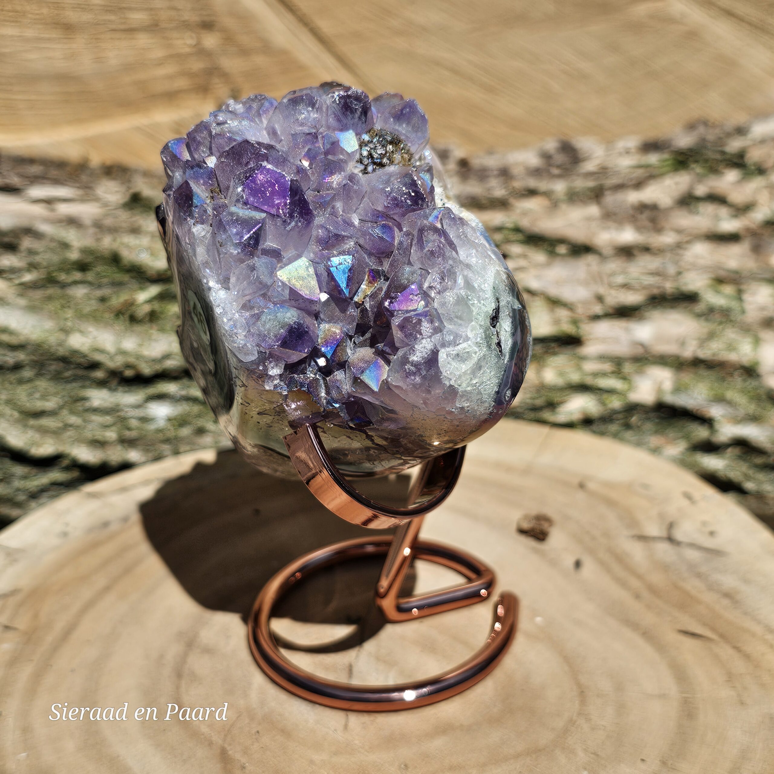 Deze Amethist heeft handmatig een Angel Aura coating gekregen. Deze coating is oa een bewerking met platinum en zilver en door verhitting krijgt de edelsteen een speciale kleur wat hem nog unieker maakt dan dat hij van nature al is. Deze laag is permanent en kan er niet afgewassen worden. Door het combineren van Amethist met Zilver en Platinum krijgt de steen ook daar zijn kwaliteiten nog extra van.