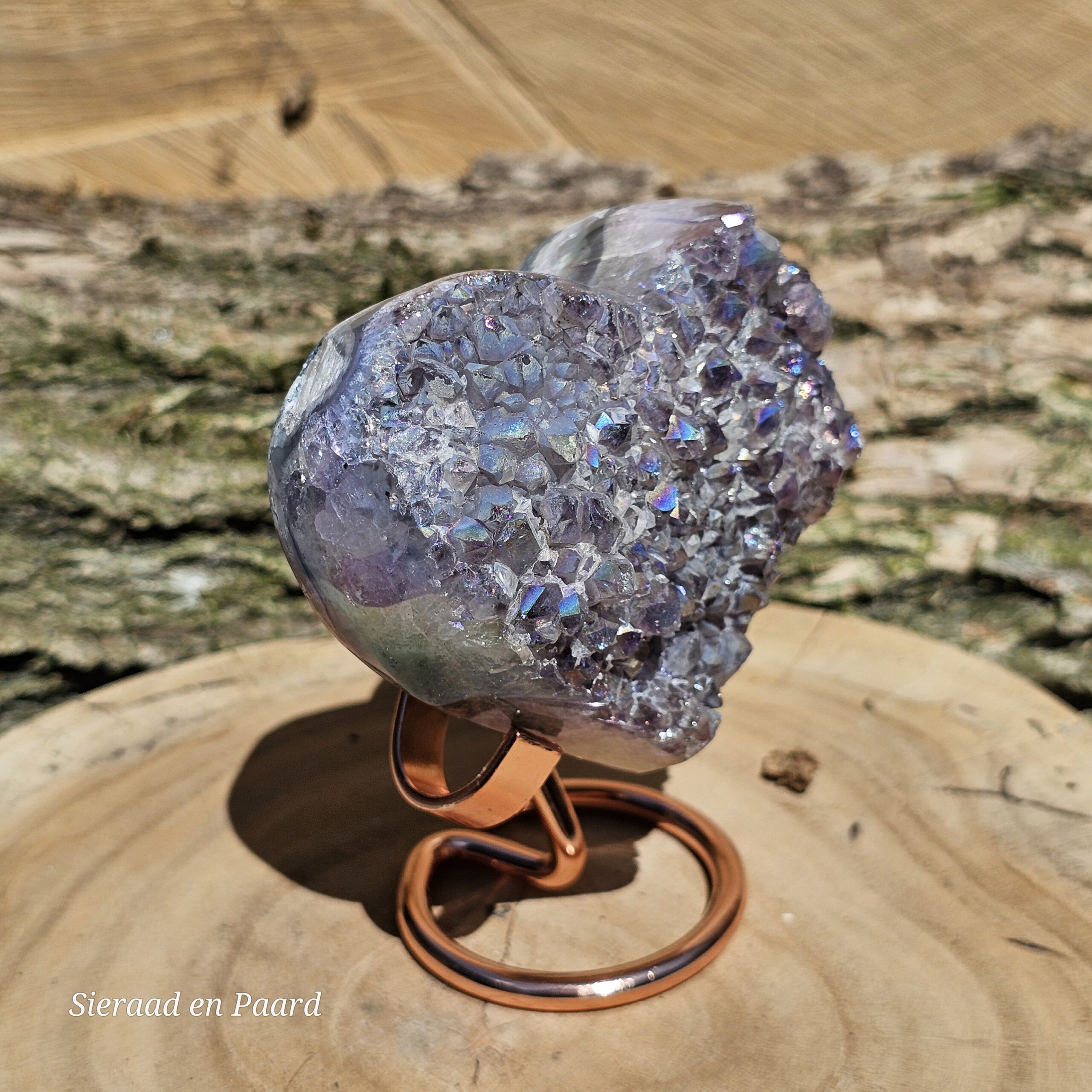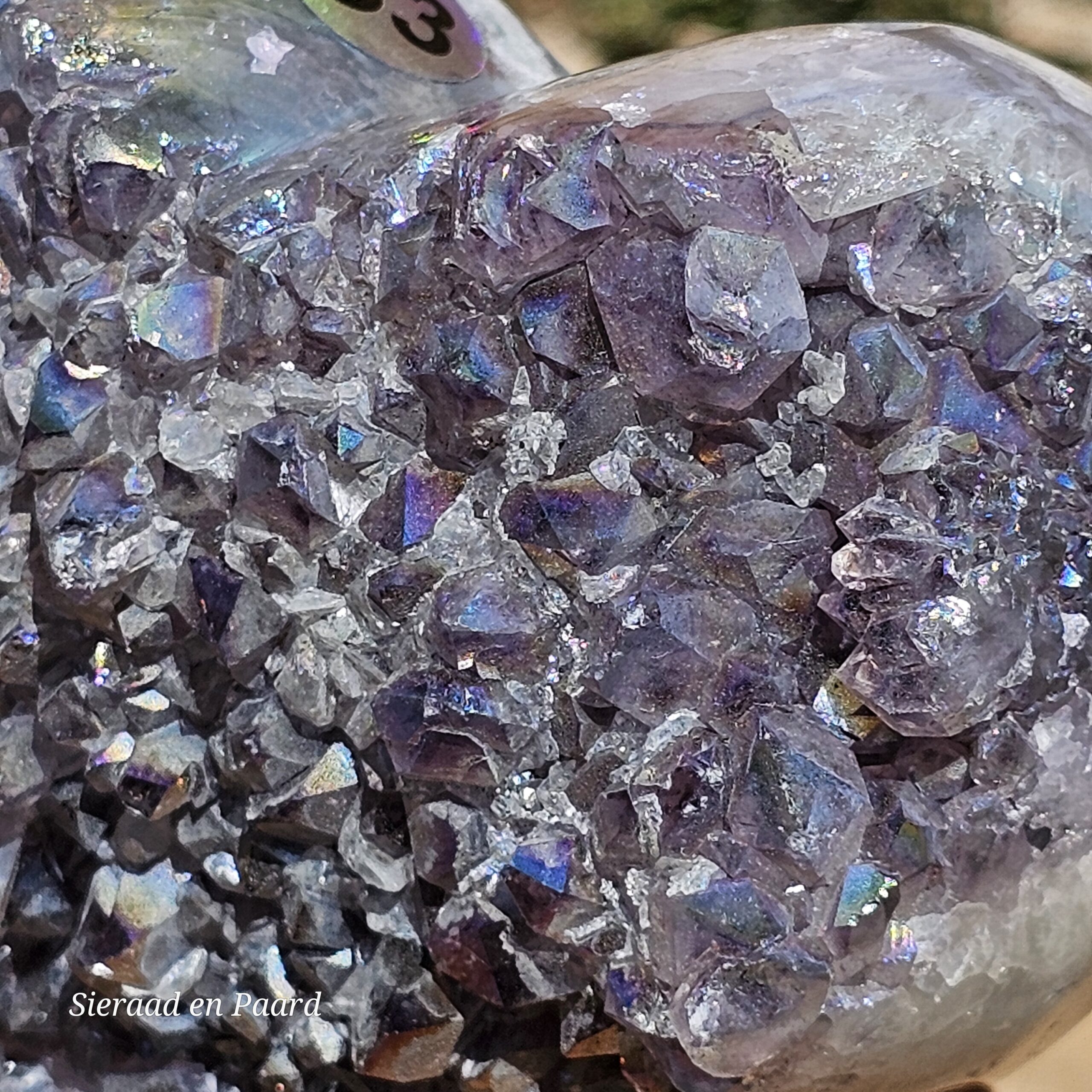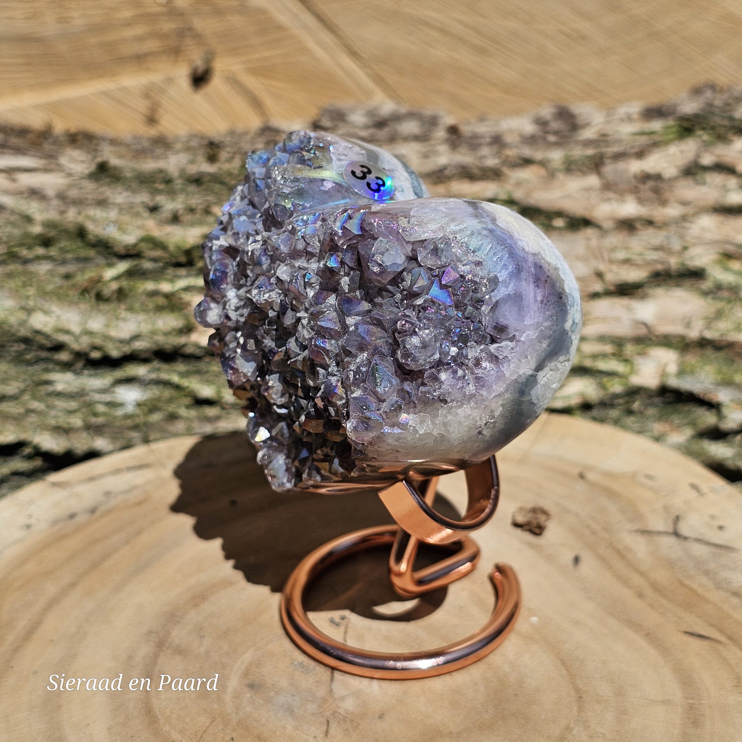 Deze Amethist heeft handmatig een Angel Aura coating gekregen. Deze coating is oa een bewerking met platinum en zilver en door verhitting krijgt de edelsteen een speciale kleur wat hem nog unieker maakt dan dat hij van nature al is. Deze laag is permanent en kan er niet afgewassen worden. Door het combineren van Amethist met Zilver en Platinum krijgt de steen ook daar zijn kwaliteiten nog extra van.