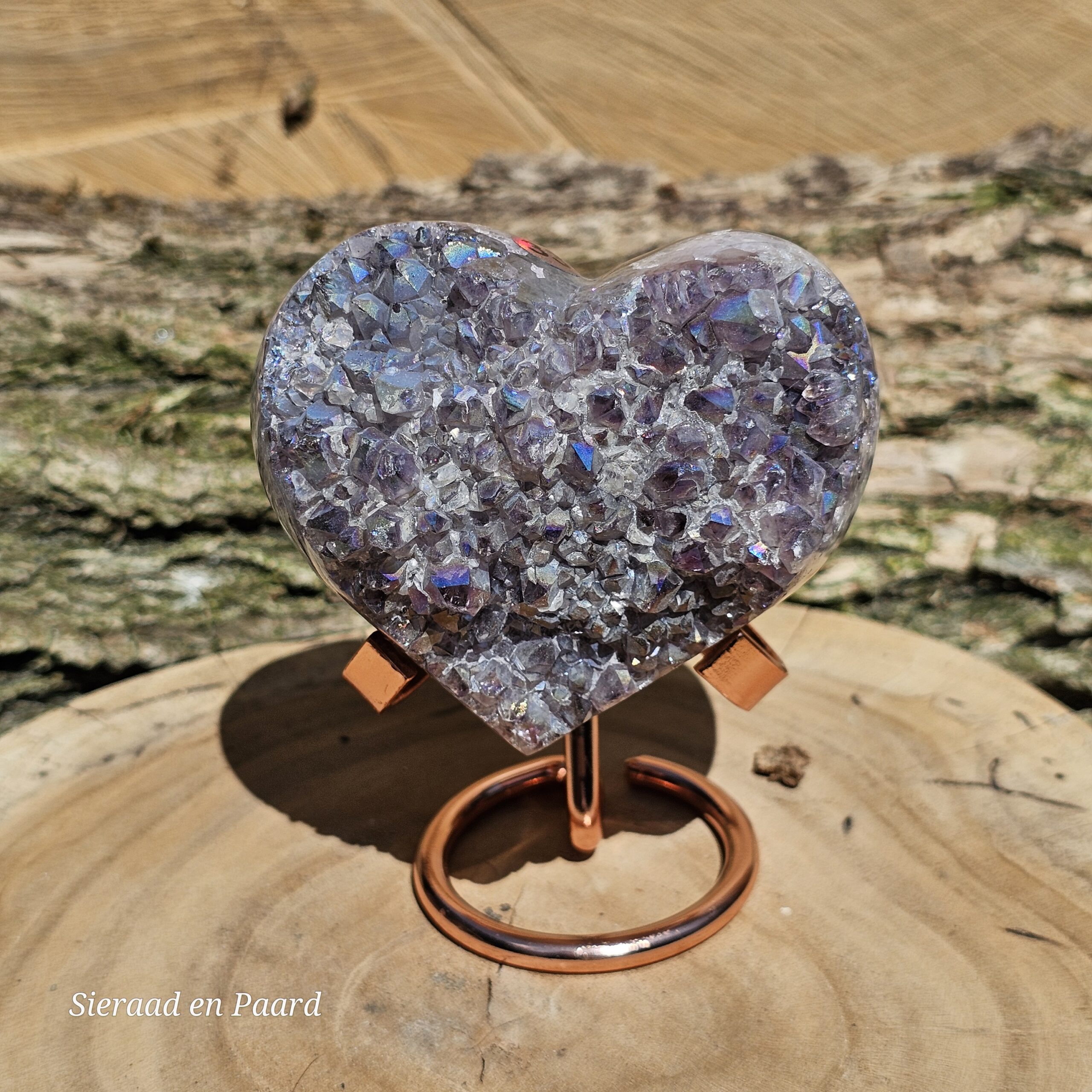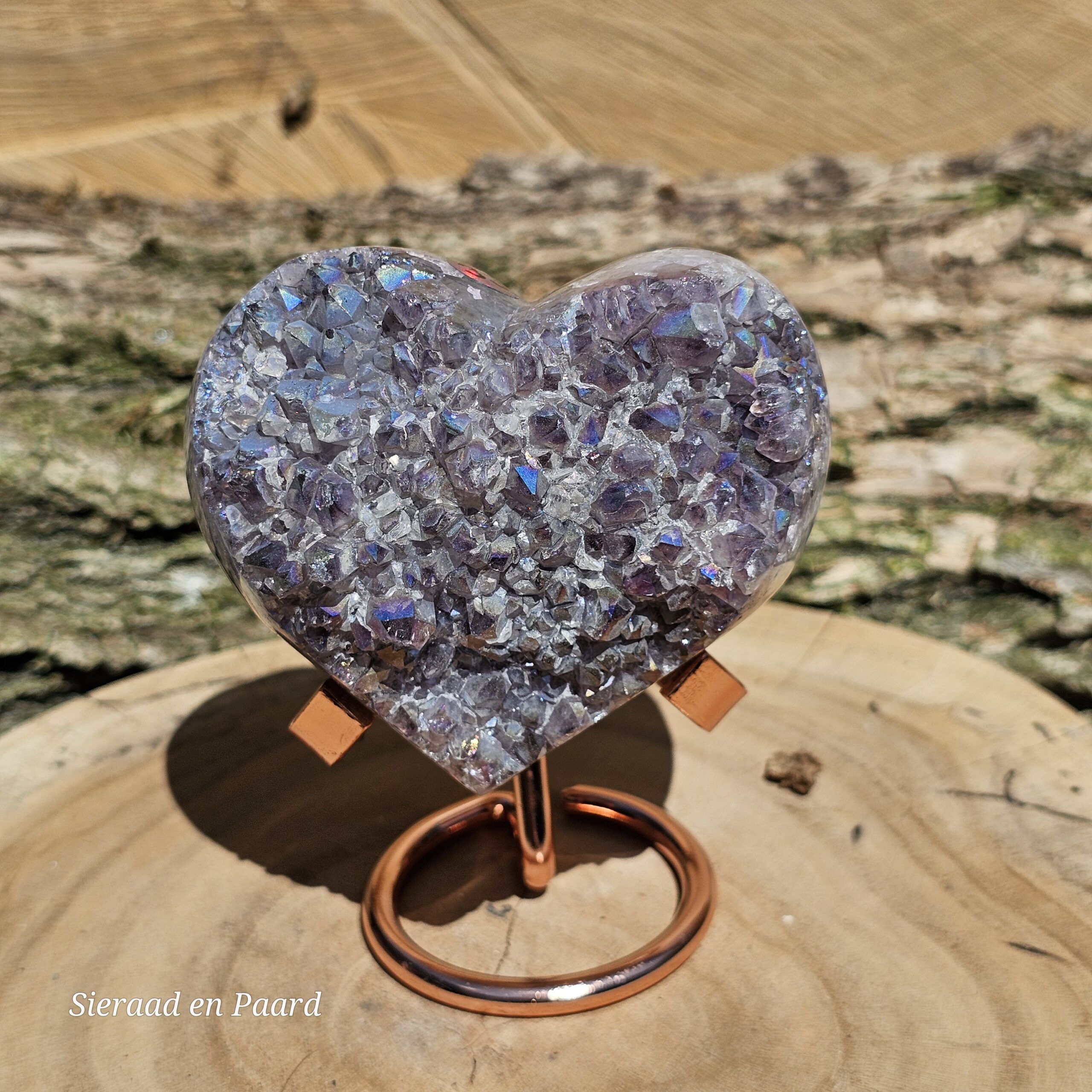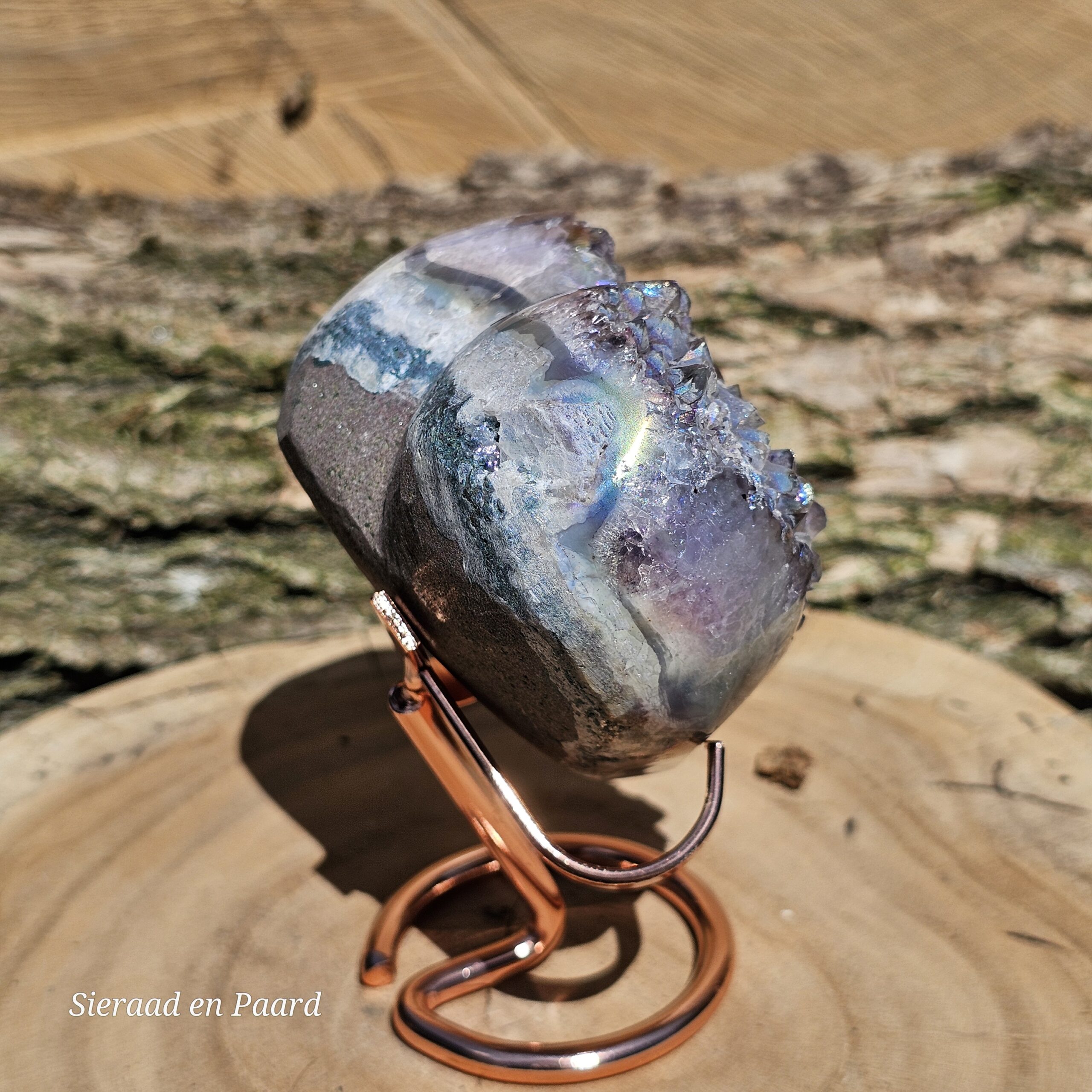 Deze Amethist heeft handmatig een Angel Aura coating gekregen. Deze coating is oa een bewerking met platinum en zilver en door verhitting krijgt de edelsteen een speciale kleur wat hem nog unieker maakt dan dat hij van nature al is. Deze laag is permanent en kan er niet afgewassen worden. Door het combineren van Amethist met Zilver en Platinum krijgt de steen ook daar zijn kwaliteiten nog extra van.