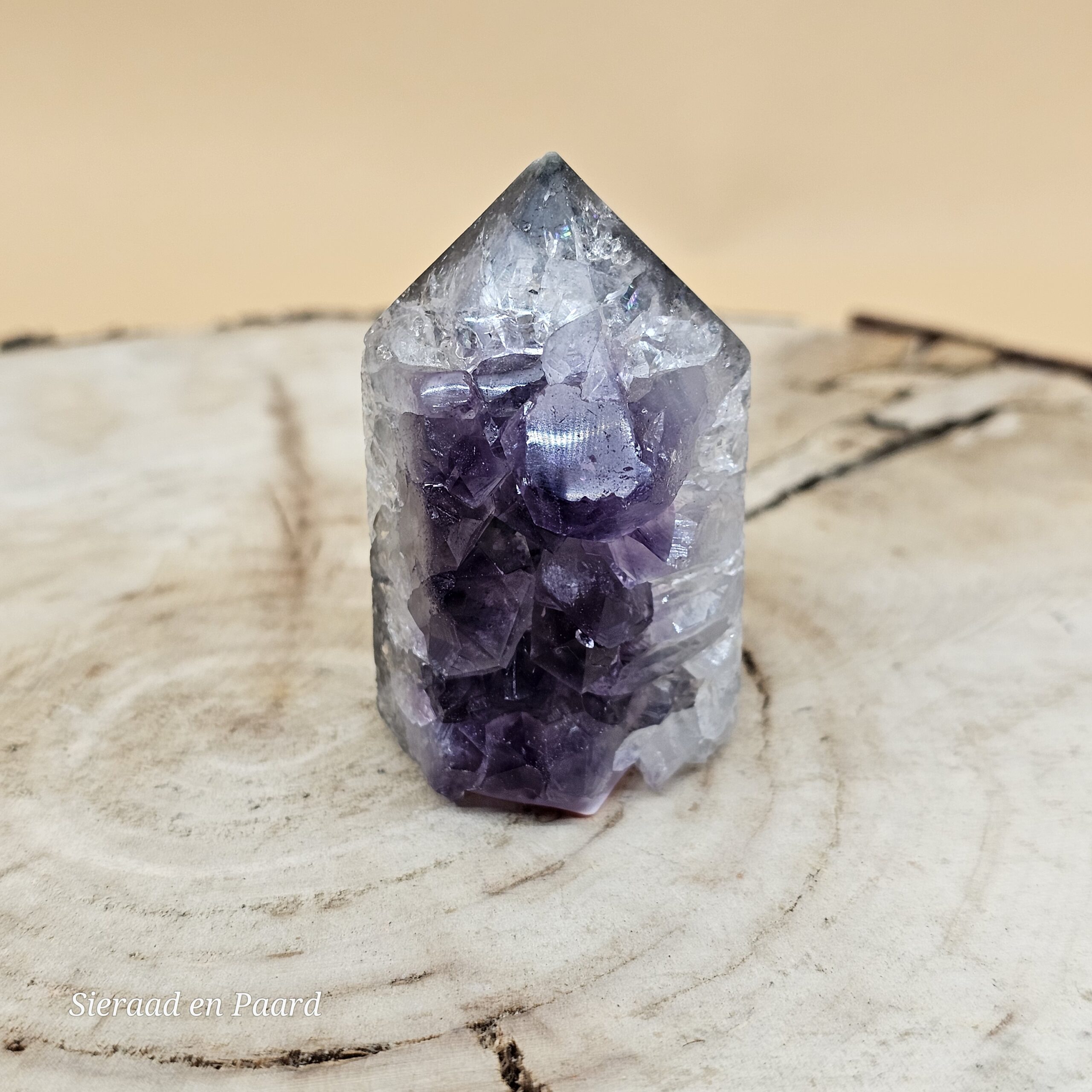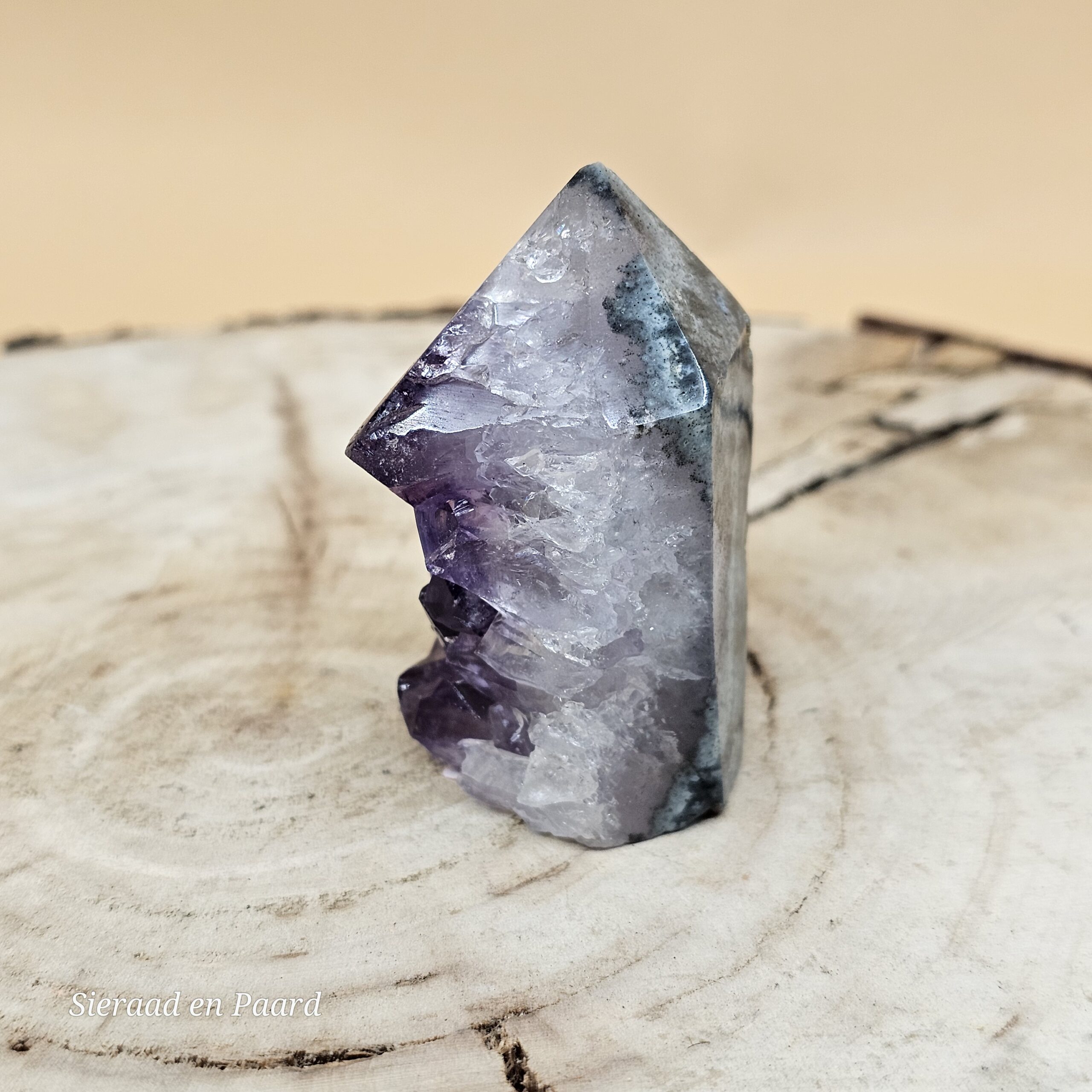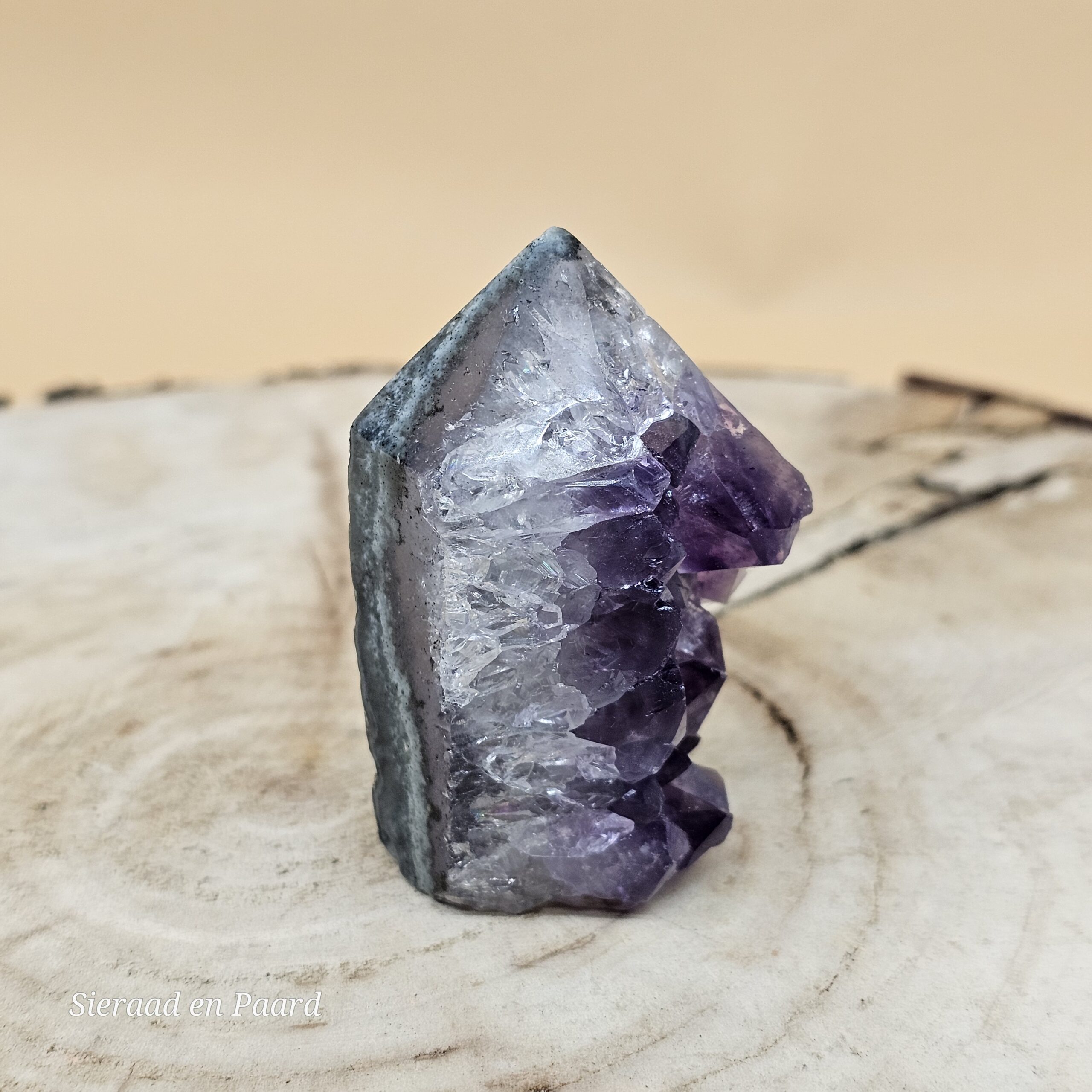 Amethist heeft een beschermende en zuiverende werking. De steen bevordert zelfinzicht en helpt je om eerlijk te zijn naar jezelf toe. Het helpt je bijvoorbeeld om verslavingen te onderkennen en aan te pakken.