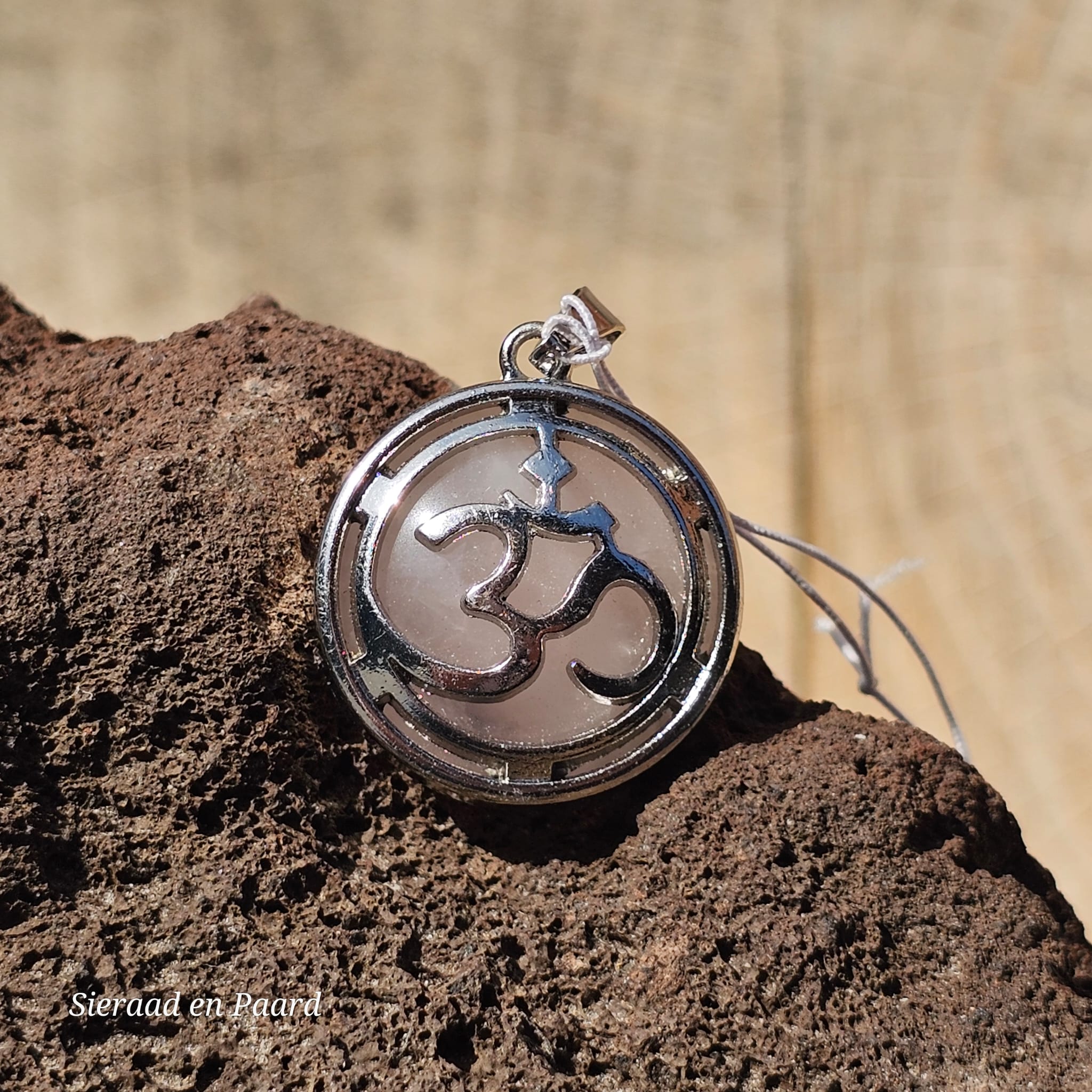 Een stuk rozenkwarts gevat in een hanger met een ohm symbool.